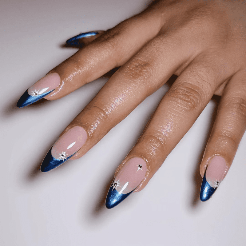 CHROME NAVY BLUE FRENCH MANICURE WITH RHINESTONES
