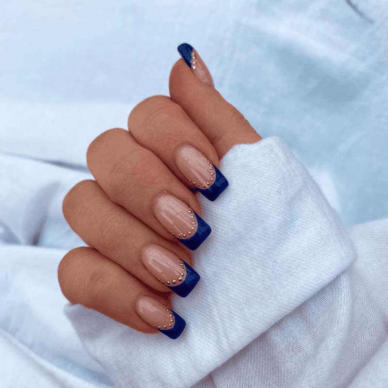 Take your navy blue French manicure to the next level of luxury with the addition of chrome and rhinestones. The tips themselves become a mesmerizing spectacle, painted in a dazzling chrome polish that shifts and reflects light in various shades of navy blue. To elevate the look even further, add strategically placed rhinestones. A single, sparkling crystal at the base of each nail adds a touch of understated elegance, while a cluster of rhinestones in various sizes and shapes on the tips creates a dramatic focal point. This combination of chrome, navy blue, and rhinestones is perfect for special occasions, a night out, or for anyone who wants to add some serious wow factor to their everyday nails. It’s guaranteed to turn heads and leave everyone breathless.