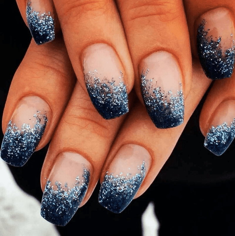 Dazzle and delight with glitter navy blue French tips! This glamorous design combines the classic elegance of navy blue French tips with the festive sparkle of glitter. The tips then transform into a glittering masterpiece, painted in a rich navy blue infused with shimmering flecks of silver or even holographic glitter. You can customize the intensity of the sparkle to suit your mood. Opt for a subtle hint of shimmer for a touch of understated glamour, or unleash your inner party animal with a generous dusting of glitter that shimmers and catches the light. Glitter navy blue French tips are perfect for a night out, a special occasion, or simply for adding a touch of everyday sparkle to your fingertips.
