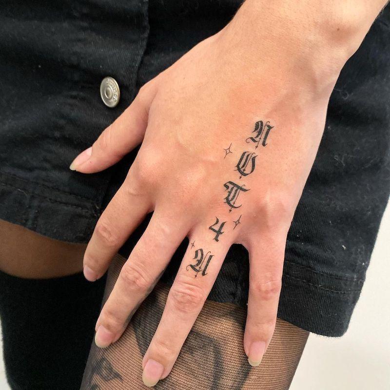Catering to those with a penchant for individuality, the artistic name hand tattoo in bold black ink emerges as the preferred design. Positioned on the side of the wrist, this minimalist aesthetic lacks any background designs, allowing each letter to stand out. This medium-sized design transforms each letter into a stylish statement, imparting an extraordinary look to your hand.