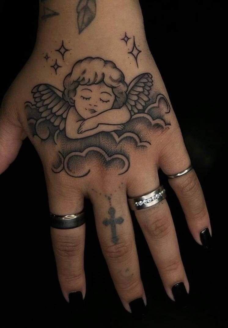 Having an angel inked on your hand creates a captivating tattoo design. While angels are commonly chosen as tattoo motifs, their charm remains timeless. If you share a love for angels and desire to have one for yourself, getting it on your hand will undoubtedly result in a mesmerizing appearance.