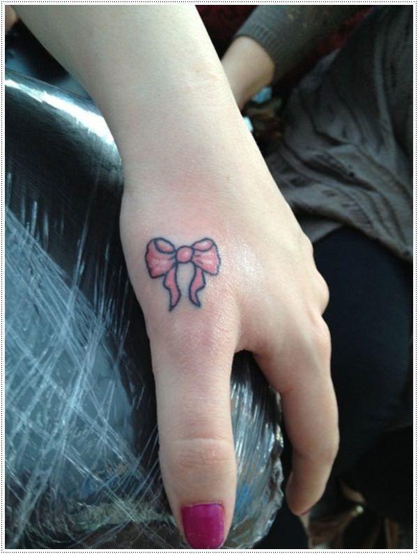 A delightful small bow, delicately inked on your hand, creates a beautiful and charming hand tattoo. This unique and uncomplicated design is perfect for individuals seeking simplicity in their hand tattoos. The cute bow adds a touch of elegance and can be a subtle yet stylish expression of personal style.