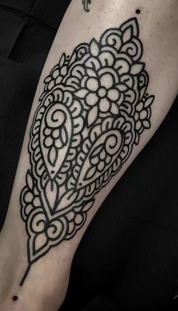 This intricate tattoo features celestial symbols and a spiral galaxy at its core. The interconnected patterns evoke the vastness of the universe and the harmonious dance of celestial bodies, blending art and science seamlessly.