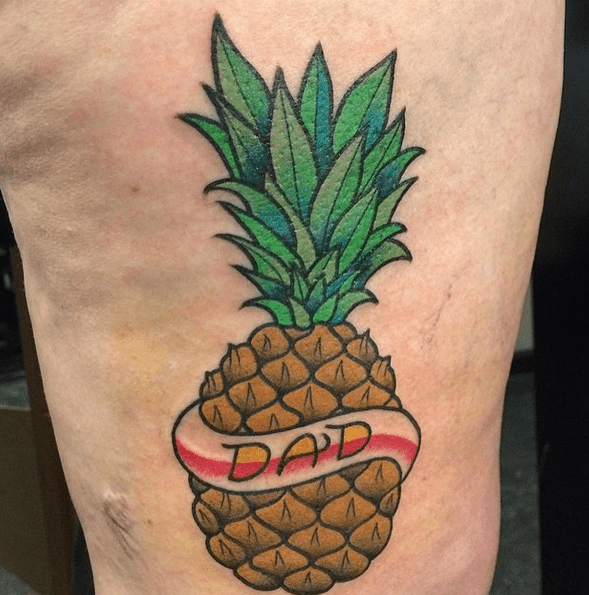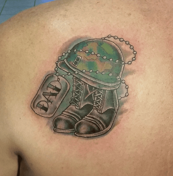 This tattoo honors classic tattoo artistry with a modern twist. Bold lines and vibrant colors bring iconic symbols to life, making a powerful statement that pays tribute to traditional roots while incorporating a contemporary flair.