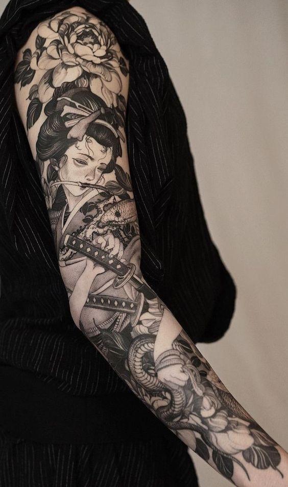 A tribute to traditional Japanese architecture, this design features pagodas and cherry blossoms, creating a serene landscape on the arm. It’s perfect for those who appreciate intricate art and the cultural beauty of Japanese tradition.