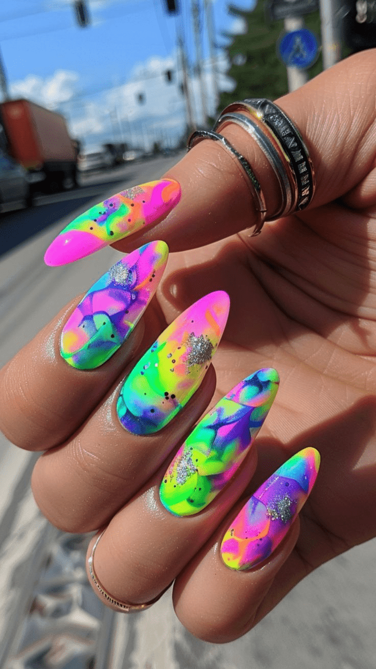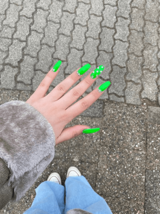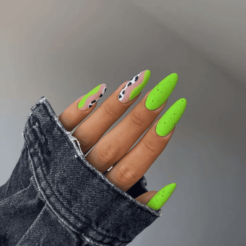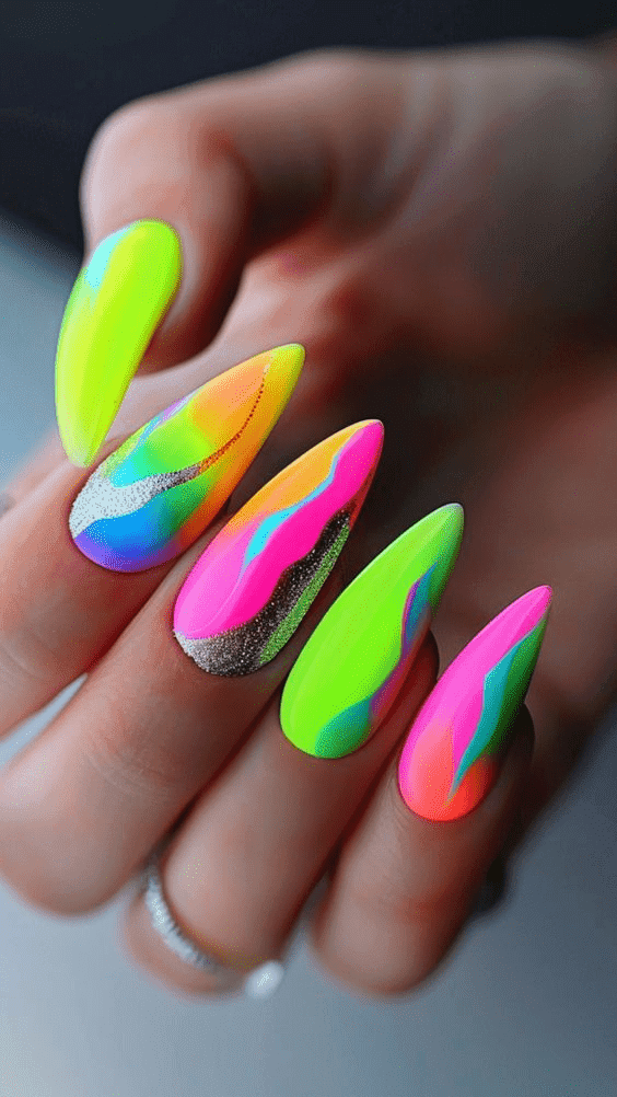 Neon Accent Burst nails bring a dynamic and electrifying touch to any manicure, combining the understated elegance of neutral or muted base colors with striking bursts of neon. This style features vibrant accents in hues like neon yellow, hot pink, electric blue, and fluorescent green, strategically placed to create a captivating contrast. Whether it’s a bold stripe, a geometric pattern, or a splash of neon on a single nail, these bright accents add a modern and edgy twist to your look. Perfect for those who want to experiment with color without overwhelming their entire nail design, Neon Accent Burst nails offer a balance between subtlety and boldness. This trend is ideal for making a statement at parties, festivals, or simply adding a pop of excitement to your everyday style, showcasing your fun and adventurous spirit.