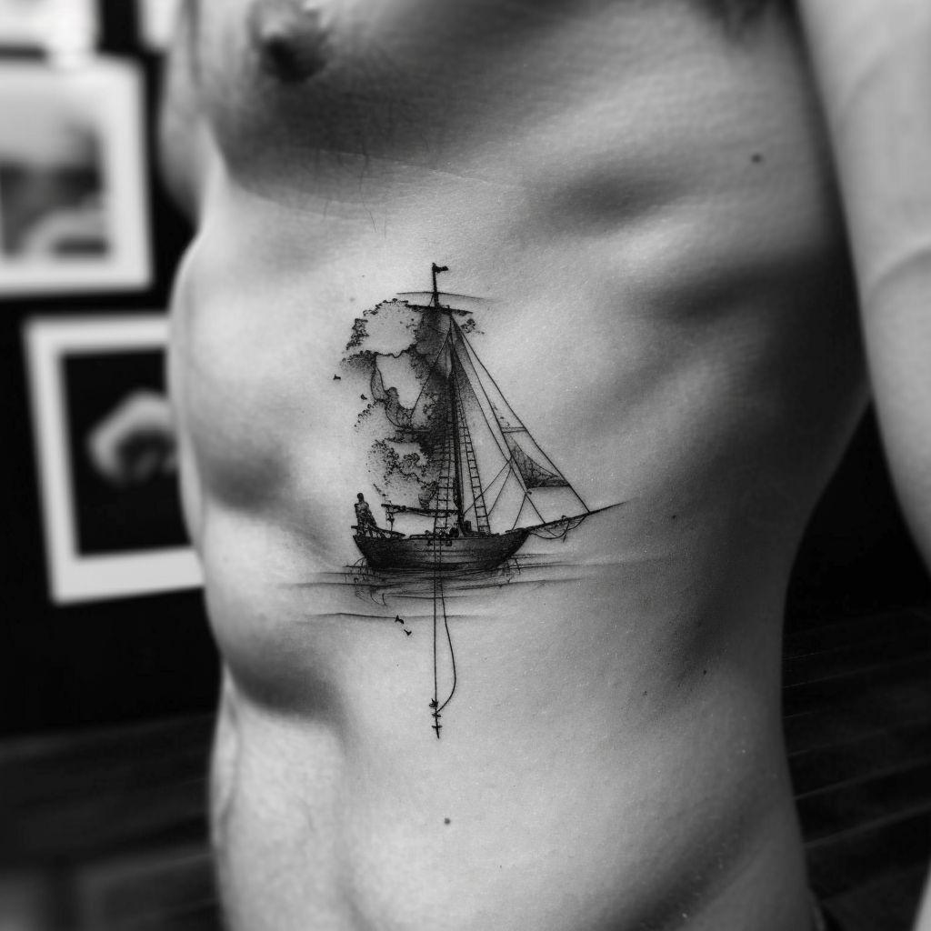 A timeless sailing ship adorns the side body, its masts towering, ready to brave the winds and waves. This tattoo symbolizes a love for adventure and the open sea. The intricate details of ropes and sails make it a masterpiece that represents a journey of discovery. Perfect for those who view life as an ongoing voyage.