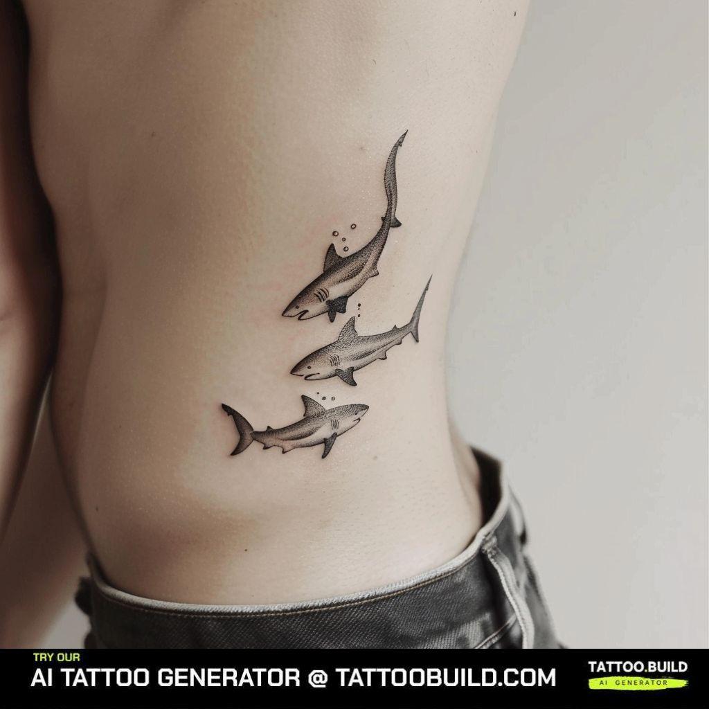 A trio of sharks glides down the side, their streamlined forms captured in fine detail. Sharks symbolize strength, survival, and efficiency. This tattoo is ideal for someone who resonates with the shark’s powerful and commanding presence in the ocean.