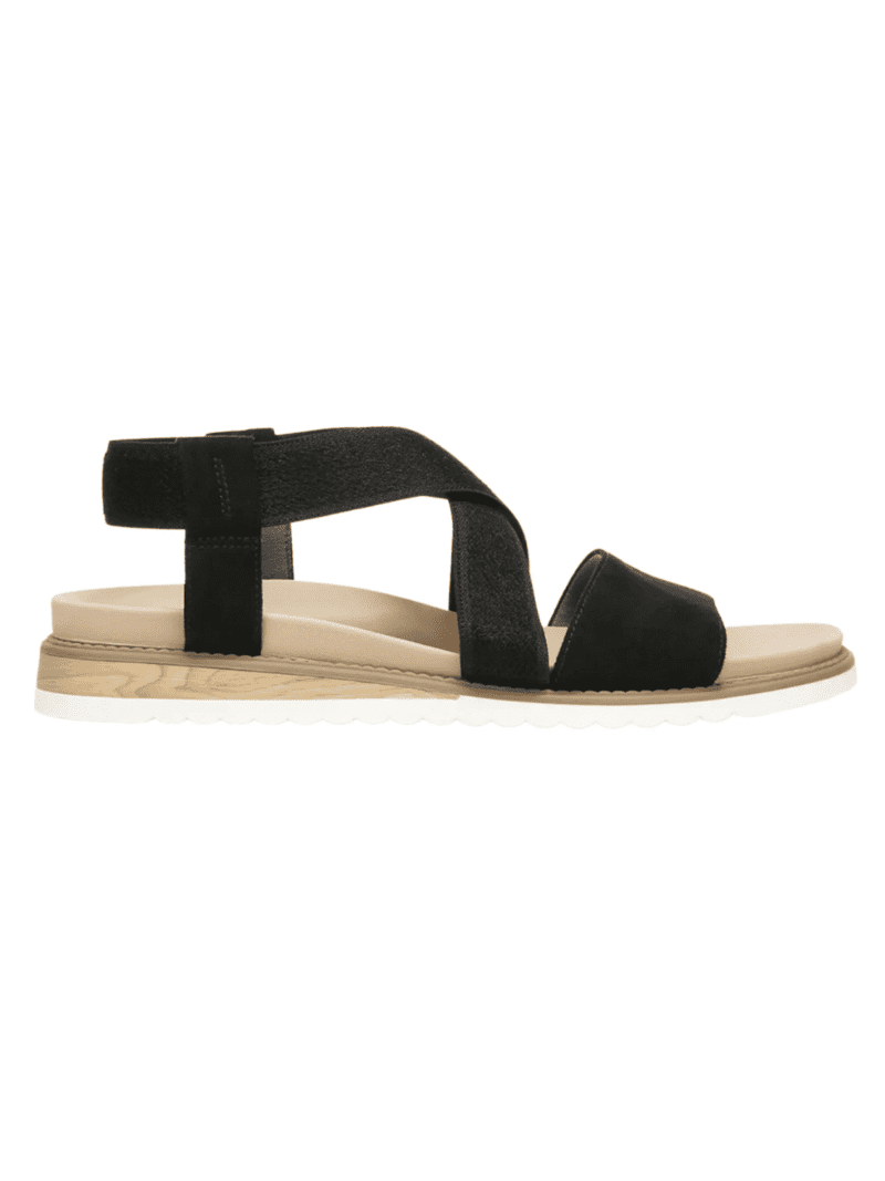 Designed for day-long comfort, the Munro Corine Sandal is a practical and stylish choice for everyday wear. These sandals prioritize both function and aesthetics. A fisherman-style silhouette with a cushioned footbed offers arch support to keep your feet happy throughout the day. The upper is crafted from luxurious leather that adds a touch of sophistication, while the textile lining and insole provide breathability and comfort. Munro incorporates a contoured cork footbed with a suede sock for additional cushioning and a plush feel. An easy-to-use hook-and-loop closure ensures a secure and adjustable fit, while the open round toe offers a relaxed and breezy feel. The outsole is made from a durable suede material that provides traction for various surfaces. Available in a classic black color, the Munro Corine Sandal seamlessly transitions from casual outings to light walks, making them a versatile choice for the woman who prioritizes both comfort and style.