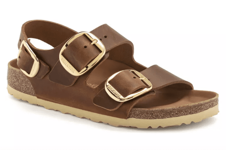 Birkenstock’s Milano Big Buckle Sandal offers a sophisticated twist on a classic comfort sandal. It caters to those who want a touch of style without sacrificing Birkenstock’s renowned comfort. The Milano features a sleek, minimalist design with three adjustable straps and an oversized, eye-catching buckle that elevates the look from casual to chic. Constructed from smooth leather, the sandal prioritizes both durability and a luxurious feel. Comfort remains a focal point, however. The Birkenstock hallmarks are present: a contoured cork footbed that molds to your foot shape for personalized support and a pronounced heel cup that promotes stability and reduces fatigue. Whether you’re looking for a comfortable sandal with a touch of Italian flair or a brand known for exceptional arch support, the Birkenstock Milano Big Buckle Sandal is a stylish and functional choice.