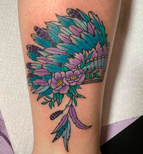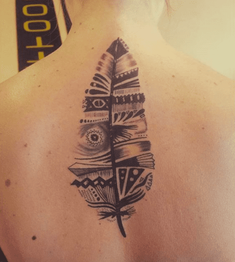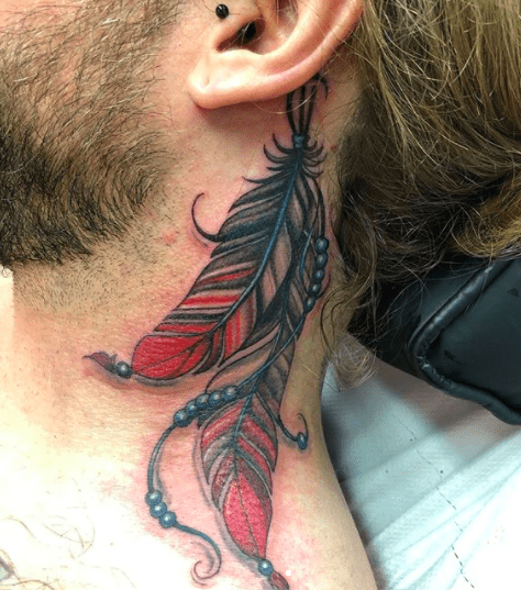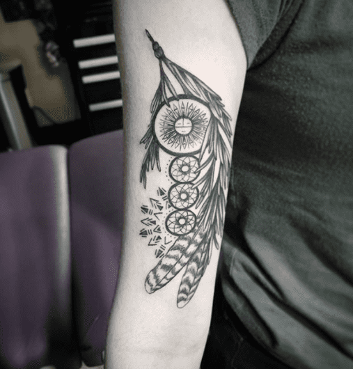 An armband tattoo with a feather design is a unique and elegant piece of body art that wraps around the arm, typically just above the bicep or on the forearm. The feather is often depicted as flowing and delicate, with intricate detailing to capture the natural texture and fine lines of each individual strand.