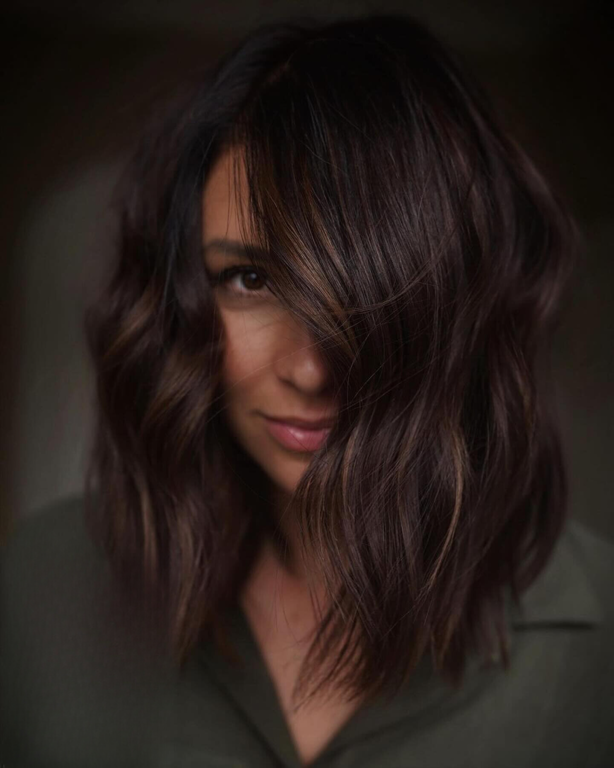 A chic, edgy asymmetrical lob is perfect for women who want a modern twist on the classic lob. The slightly longer side adds intrigue, while the rich, multi-dimensional color elevates the medium-layered look, making it a standout choice for those seeking a bold yet stylish 2024 bob.