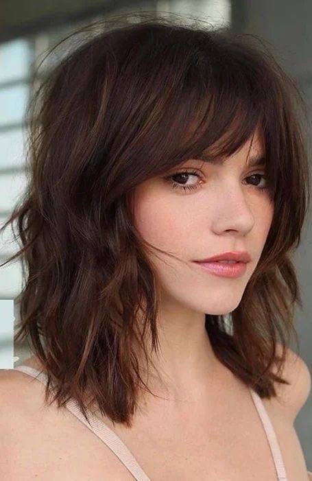 A timeless mid-length bob with bangs, this hairstyle is versatile and works for women of all ages. The warm brown tones provide a natural, flattering look, while the fringe adds structure and softness, especially for round faces.
