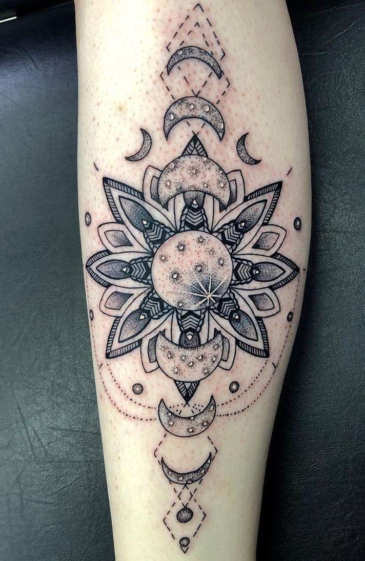 Here’s another standout favorite among our tattoo ideas. In this captivating design, three moon phases grace the arm, with a majestic full moon taking center stage. Surrounding the full moon is an intricately patterned mandala, adding a touch of exquisite detail to the composition. To elevate the design further, the tattoo is adorned with sparkling jewels. This unique and stunning creation can be replicated as is, or you have the freedom to opt for a different mandala pattern to infuse your personal touch.