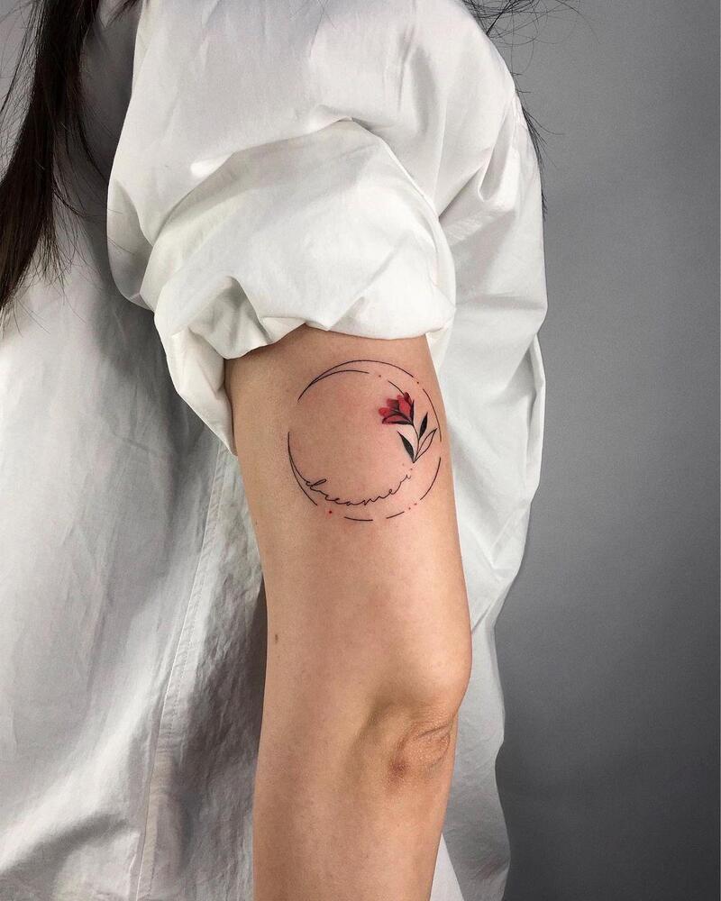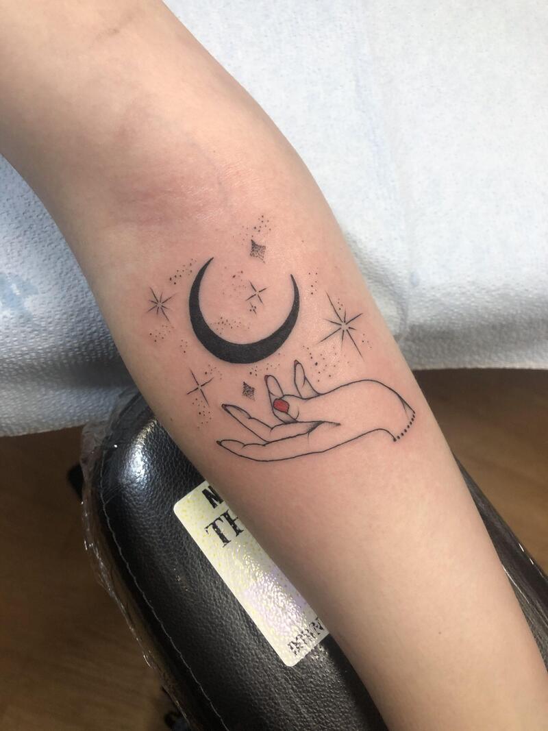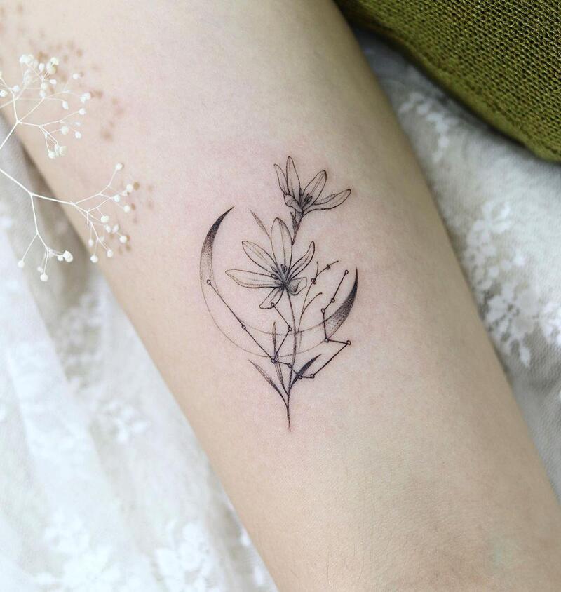 Crafted with a minimalist approach, this tiny wrist tattoo utilizes a mere few strokes to create a subtle yet perfect design. Pay attention to the artist’s clever technique of doubling the moon’s outline, seamlessly transforming it into the stem of a delicate flower. The simplicity of this piece adds to its charm, making it an ideal choice for those seeking a discreet and artfully nuanced wrist tattoo.