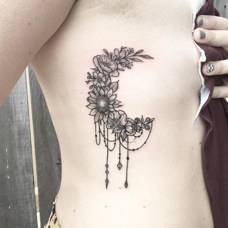 Rib tattoos continue to surge in popularity, and with designs like this one, it’s easy to understand why! Behold this breathtaking rib tattoo, showcasing a central lotus surrounded by celestial moons above and an intricate botanical pattern below. The sheer beauty of this tattoo is undeniable, but it also carries a positive message, symbolizing beauty, strength, empowerment, and more.