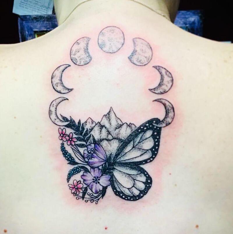 design presents a harmonious fusion of both elements. The focal point is a gracefully depicted butterfly positioned at the center, encircled by elegantly rendered moon phases. Beyond its visual appeal, the tattoo holds profound symbolism, drawing parallels between the transformative phases experienced by both the butterfly and the moon.