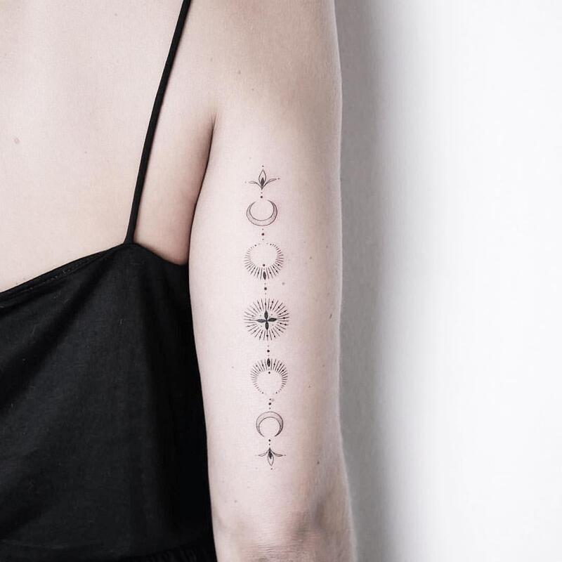 Let’s start with this exquisite moon phase design, artfully inked on the arm. Positioned at the center is the full moon, surrounded by the remaining phases on both sides. This tattoo, both simple and stunning, possesses a universal appeal suitable for anyone seeking celestial-inspired body art. Feel free to replicate this exact design or opt for a similar rendition placed in a different location – envision it gracefully adorning the ribcage or following the spine for a particularly chic and intriguing effect.