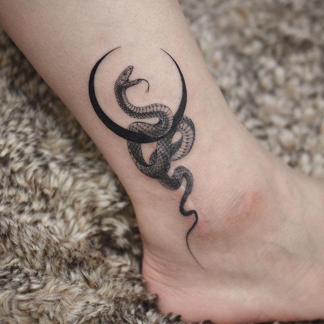 A sleek, solid black moon seamlessly complements the presence of a fang-bore snake in this tattoo. The sinuous creature offers a plethora of placement opportunities, allowing for creative and varied ways to coil around the moon. The bold and minimalist approach to the moon, coupled with the intricate detailing of the snake’s movement, results in a visually striking composition that captures the essence of celestial and serpentine elements coexisting harmoniously.