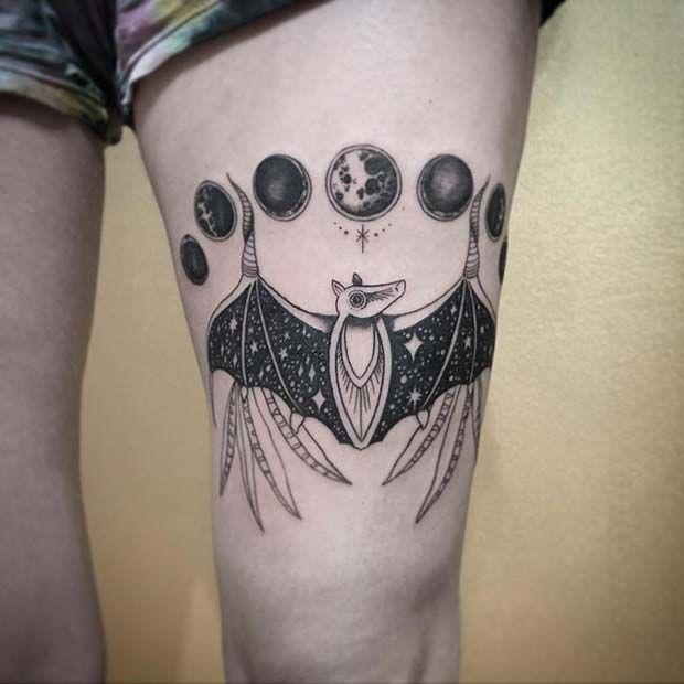 The nocturnal allure, we bring you an incredible bat tattoo, strategically placed on the leg. The design showcases a prominent bat with the moon phases elegantly positioned above. This imaginative concept is a perfect choice for bat enthusiasts, drawing a fascinating connection between these creatures of the night and the lunar phases.
