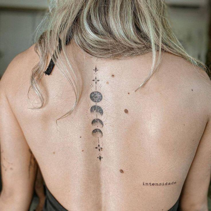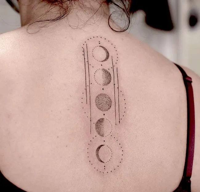For those desiring a sizable tattoo with the power to captivate onlookers, this one is tailor-made for you. Presenting a back tattoo where the moon phases gracefully cascade down the spine, each moon is rendered in bold black with intricate cut-out patterns. The uniqueness of this design is truly exceptional, offering a mesmerizing and unusual portrayal of lunar phases.