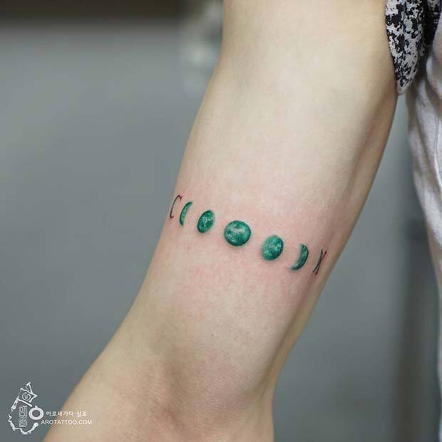 If you are looking for a more unique tattoo, then this idea is perfect for you. Here we have a moon phase tattoo with a full moon with two phases on either side. The moons are also colored in a mystical green shade. There is a C and K on the design too, but this is to spell out cook as the tattoo was originally for a chef. You can, of course, recreate the quirky green moon tattoo without the letters or maybe you could add two that mean something to you.