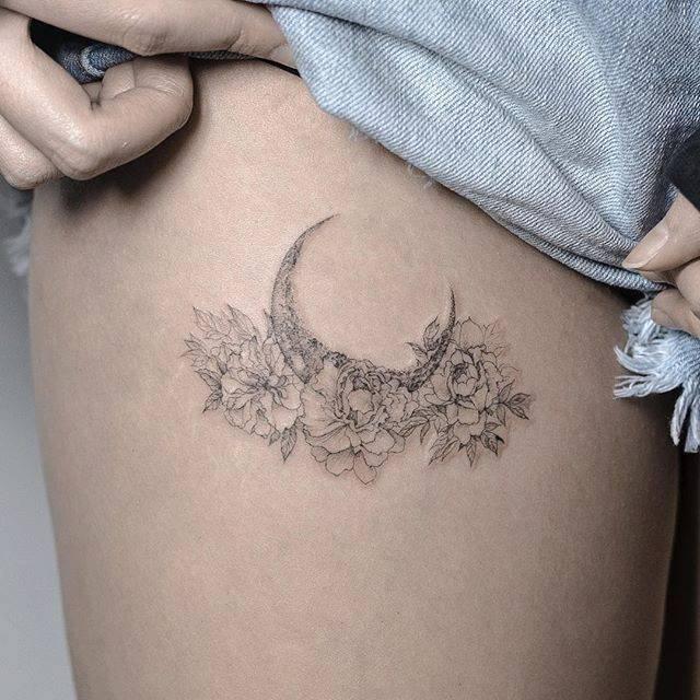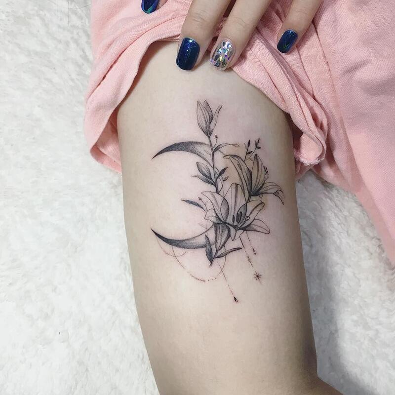 This thigh tattoo showcases the boundless creativity in crafting a flower and crescent moon design. The delicate line shading intricately accentuates the cherry blossom petals, allowing them to gracefully emerge against the backdrop of the crescent moon. The result is a beautifully balanced and visually striking piece, showcasing the versatility of floral and celestial elements when harmoniously blended in body art.
