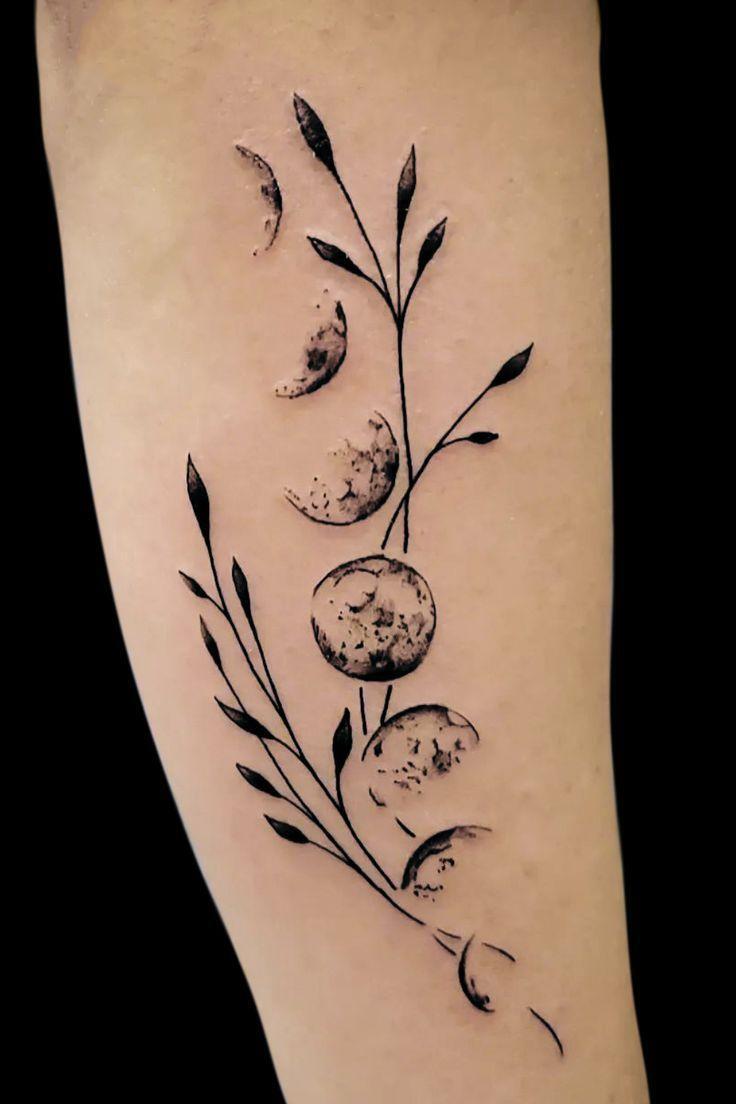 This next tattoo stands out for its exceptional uniqueness. Featuring botanical moon phases, the full moon takes the form of a complete flower, while the other phases are elegantly portrayed with intricate leafy patterns. This beautiful and unconventional design is particularly appealing to those seeking something different and those with a deep appreciation for nature.