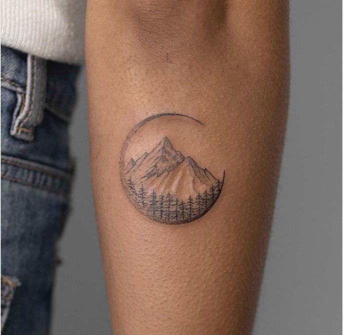 In this tattoo, a skillful combination of line and dot work gives life to an intricate mountain moon design. The crescent shape not only serves as a distinctive framing element but also provides an ideal space for the incorporation of a second visual detail. The meticulous detailing in the combination of lines and dots contributes to the overall complexity of the design, creating a captivating composition that seamlessly blends celestial and natural motifs.