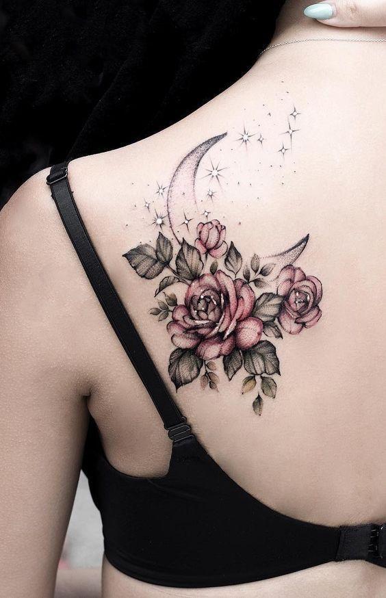 In crafting this crescent moon tattoo, the artist employs a watercolor-inspired style, incorporating delicate roses and vibrant botanical elements. Beyond their aesthetic appeal, these symbols evoke a profound connection to spirituality and nature. The infusion of color not only enhances the overall visual impact but also offers a heightened level of customization. The watercolor-esque technique lends an ethereal quality to the design, making it a truly unique and personalized expression of artistry and individuality.