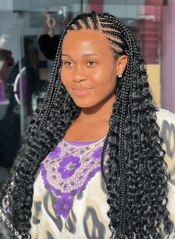 Try out the charming combination of half cornrows and half weave for a chic vacation look. Long wavy curls beautifully complement the front cornrows, adding to their allure. This stunning style is a hit on Instagram too. Simply divide your natural hair from ear to ear as with most hairstyles. Secure the front section with clips or ties, then braid the back section only. Finish by tucking the braid ends and applying hair extensions or a wig for added flair.