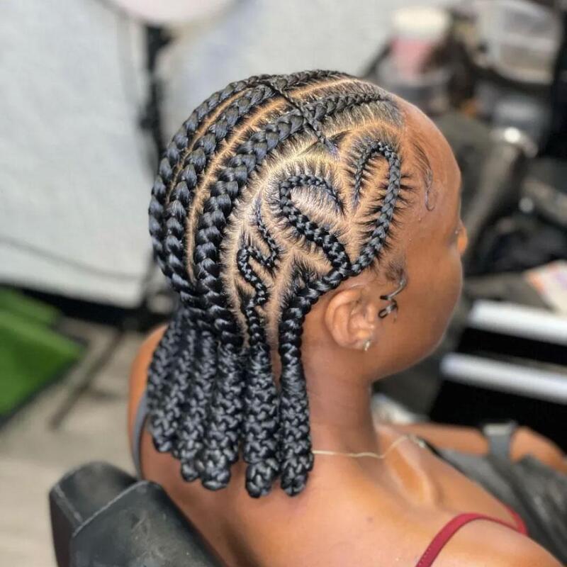 Zigzag straight back cornrows with a heart on the side offer a unique and eye-catching twist on the classic cornrow style. The zigzag parting adds a touch of playful dimension, while the heart design incorporated near the temple injects a sweet and romantic touch. This combination is perfect for those who want a protective style that’s both stylish and full of personality.