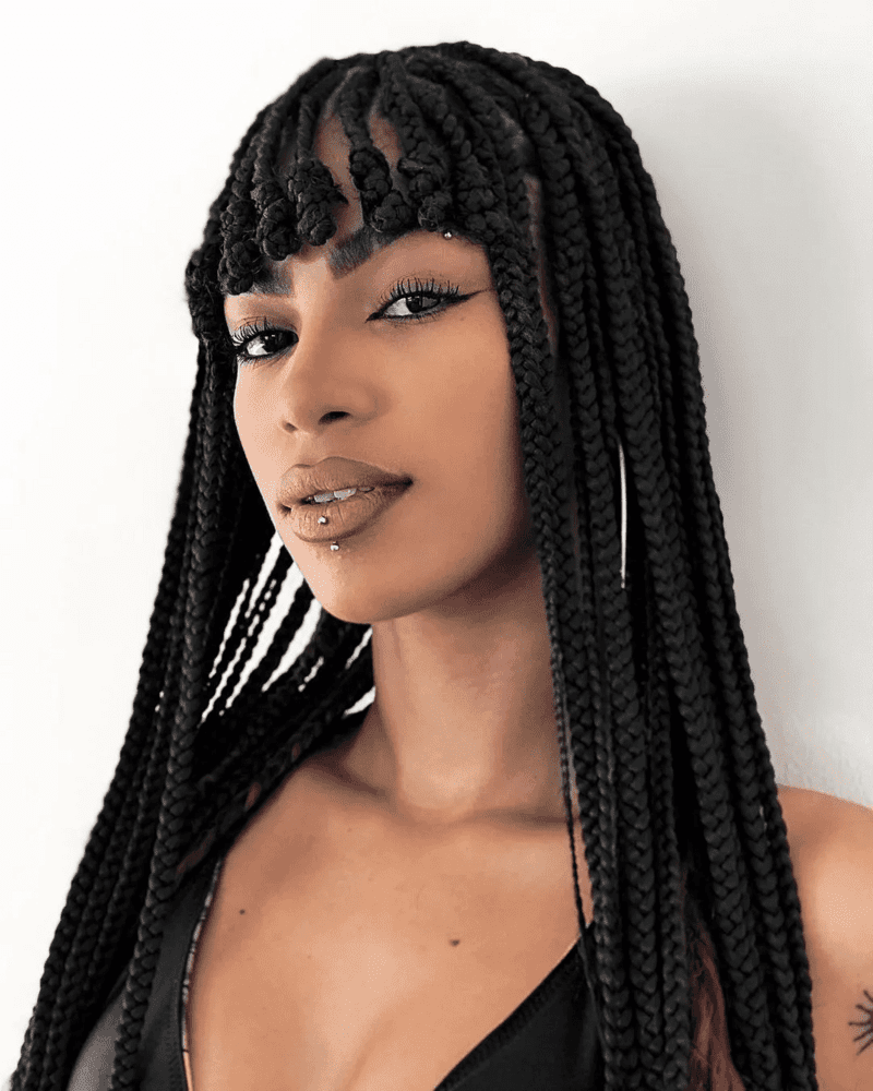 Box braids are a timeless protective style that can be adorned with bangs for a touch of youthful flair. This combination offers versatility, allowing you to style the bangs to frame your face or sweep them to the side for a touch of mystery.