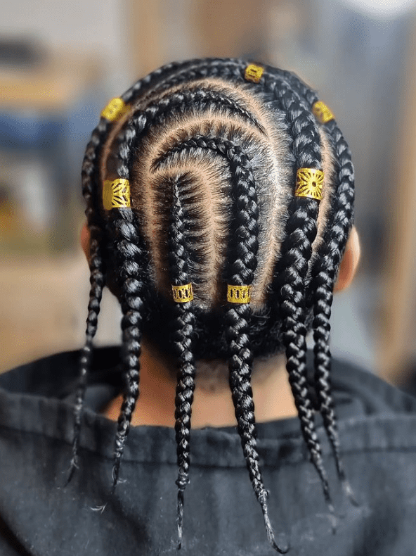 While reminiscent of simplified lemonade braids, this style offers a unique twist. Instead of intricate cornrowing patterns, it features interlaced rows created by sectioning your natural hair from the center outwards. Braiding each section with hair extensions and incorporating gold cuffs during the process creates a stunning yet straightforward look. This style requires no long hair pieces or additional techniques, making it a beautiful and achievable option for those seeking a touch of elegance without the fuss.