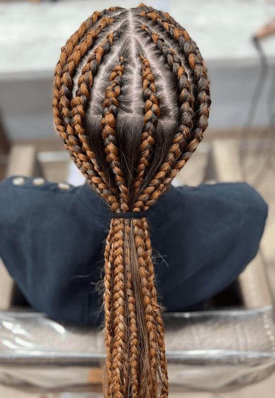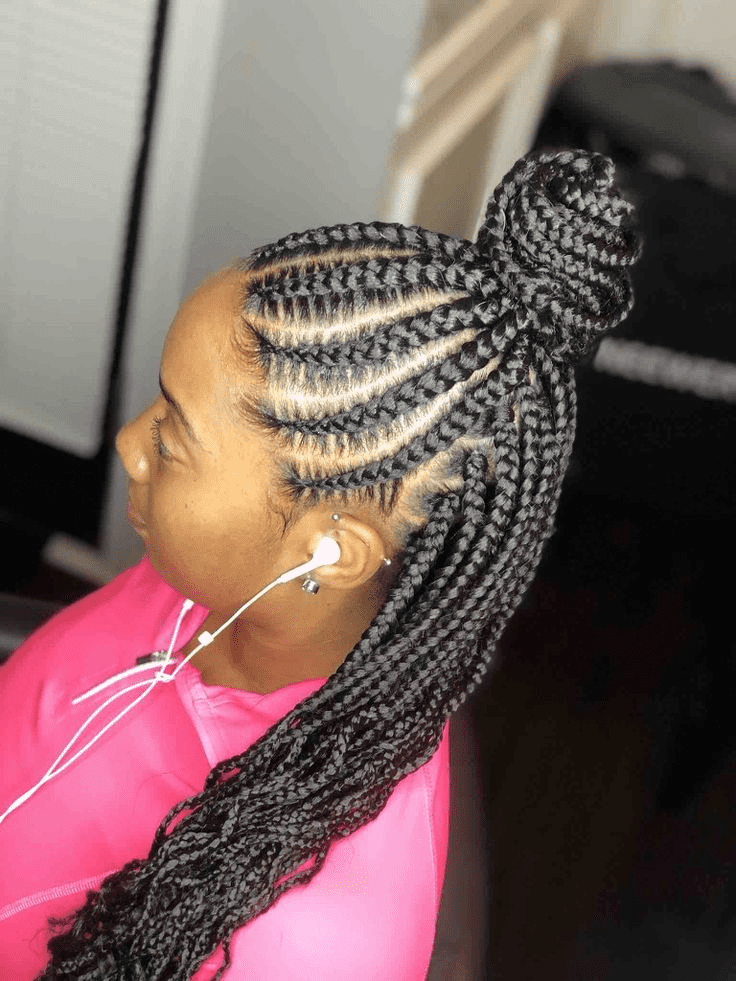 The low ponytail for stitch cornrows is a stylish and practical hairstyle that combines the sleekness of stitch cornrows with the simplicity of a low ponytail. In this hairstyle, the hair is braided into neat and tight stitch cornrows close to the scalp. Once the cornrows are complete, the remaining hair is gathered and secured into a ponytail positioned low at the nape of the neck. This hairstyle is not only chic and trendy but also functional, keeping the hair out of the face and off the neck. It’s a versatile look that can be worn for various occasions, from casual outings to more formal events. Plus, it’s easy to maintain and can last for several days, making it a convenient choice for those with busy schedules.