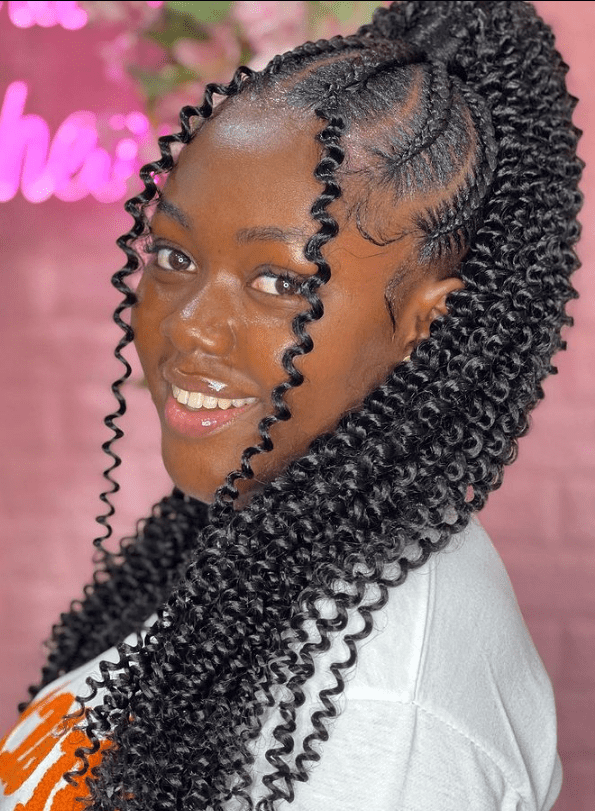 Cornrow braids in the front with a high curly ponytail in the back is a stunning and versatile hairstyle. The cornrows offer a protective style for your natural hair, while the high ponytail adds volume and drama. This combination is perfect for those who want a look that’s both stylish and practical. The curly ponytail can be styled with your natural hair or with extensions, allowing you to play with different textures and lengths. This hairstyle is perfect for any occasion, from a casual day out to a special event.