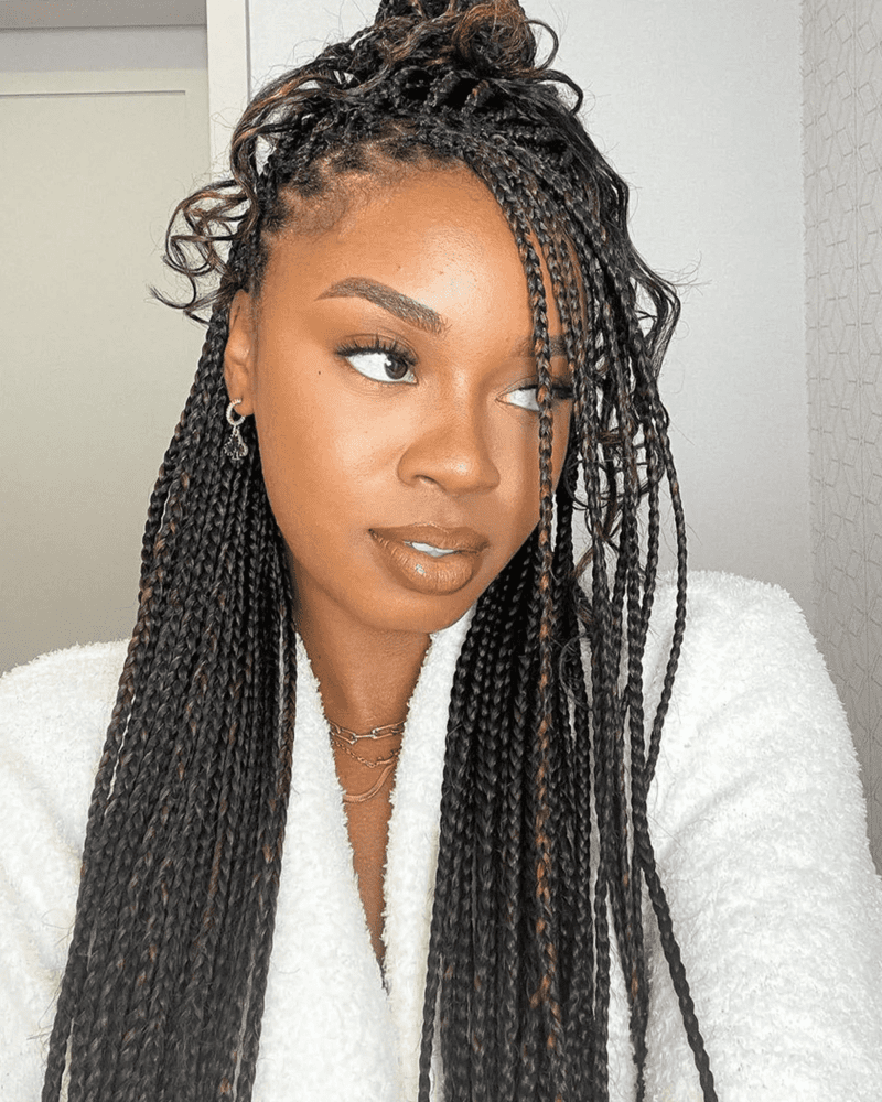 For a simple yet impactful hairstyle, consider gathering your box braids into a single giant plait. Whether you choose a side-swept or a bundled-back look, this style offers two major benefits: Firstly, it instantly elevates your look with a touch of main-character energy. Secondly, it keeps your braids neatly tucked away from your face, making it perfect for days when you want to highlight your features without the distraction of loose strands.