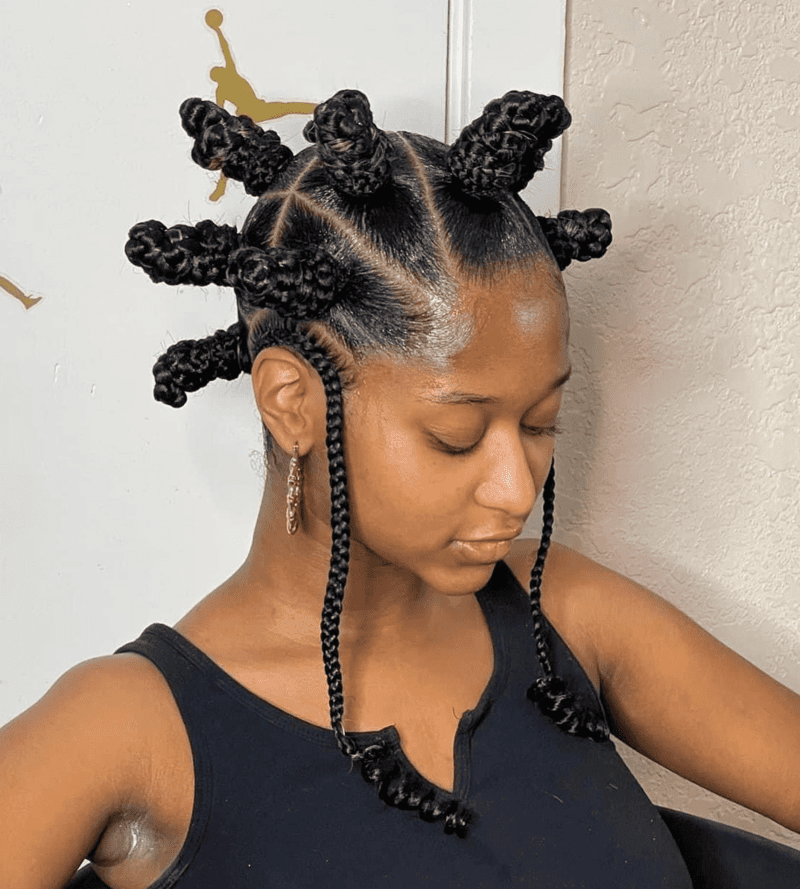 Bantu knots braids offer a unique twist on the classic Bantu knot style. Instead of simply twisting the hair sections, intricate goddess cornrows are incorporated before forming the knots, resulting in a stunningly textured look. This fusion of braids and knots creates a protective hairstyle that’s both stylish and eye-catching, perfect for those who want to add a touch of personality to their natural hair.
