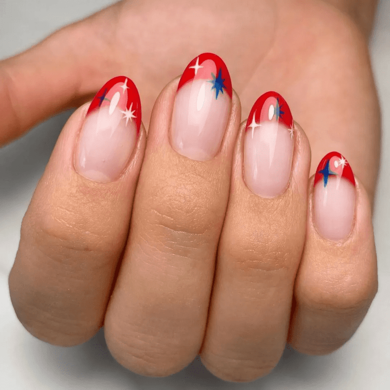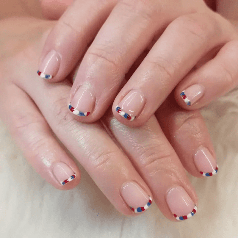 Take a classic French manicure and give it a patriotic twist with red and blue tips! Paint your nails in a neutral base coat, like nude or light pink. Instead of the traditional white tip, use a thin line of red polish followed by a thinner line of blue polish to create a chic and festive look. You can adjust the width of the lines for a more subtle or dramatic effect. This is a perfect way to show your American spirit with a touch of sophistication!