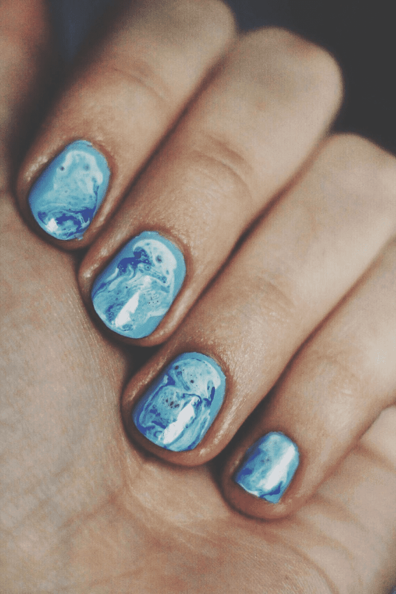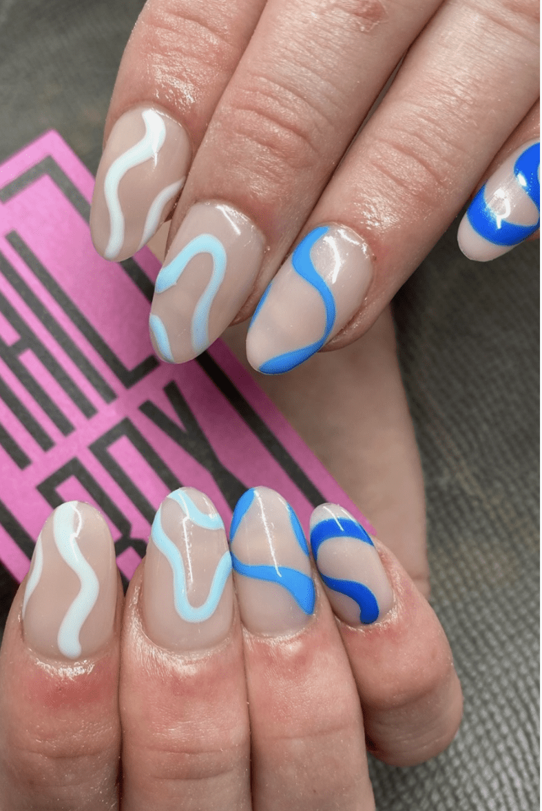 A wavy blue manicure is a simple yet elegant design perfect for summer or any occasion. To achieve this look, paint your nails a base coat in a light or medium blue shade. Then, you can use a striping tape or a fine nail art brush to create wavy lines across your nails. For a more organic look, ditch the striping tape and freehand the wavy lines with the brush. Finish with a clear top coat to seal the design and add shine.