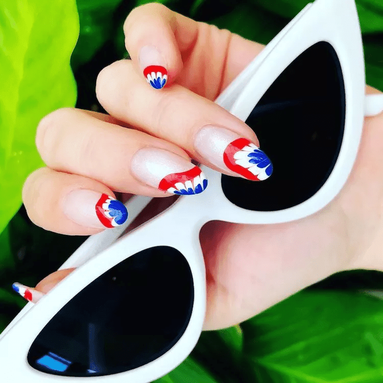 Achieve a sweet and refreshing look for Independence Day with white nails accented with blue flowers. Paint your nails a crisp white base coat and then unleash your inner artist! You can create delicate little forget-me-nots with a dotting tool or paint bolder blooms with a nail art brush. For a touch of whimsy, consider adding a single red or blue crystal as the flower’s center. This design is perfect for those who want a touch of elegance and patriotism on their fingertips.