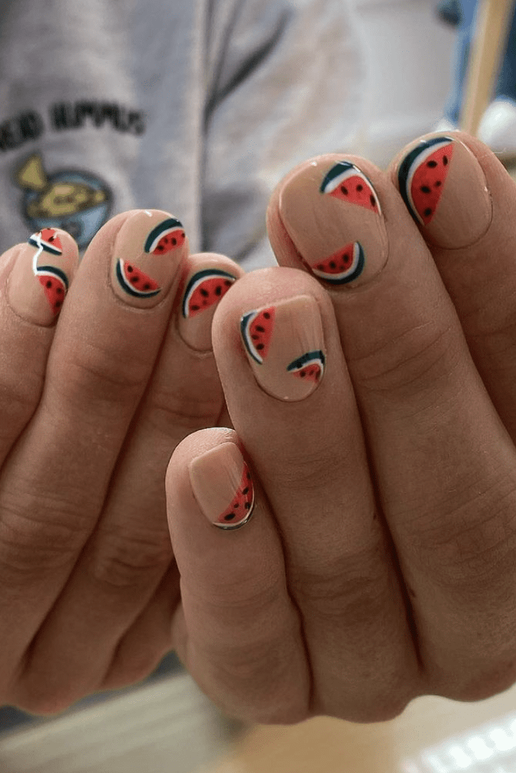 Embrace the juicy vibes of summer with watermelon sugar nails! Capture the essence of this refreshing fruit by painting your nails a crisp white base. Then, using a combination of light green and red polish, create tiny watermelon wedge shapes on each nail. Don’t forget a touch of black for the watermelon seeds or a thin green line for the rind. Finish with a clear top coat to make your watermelon slices shine!