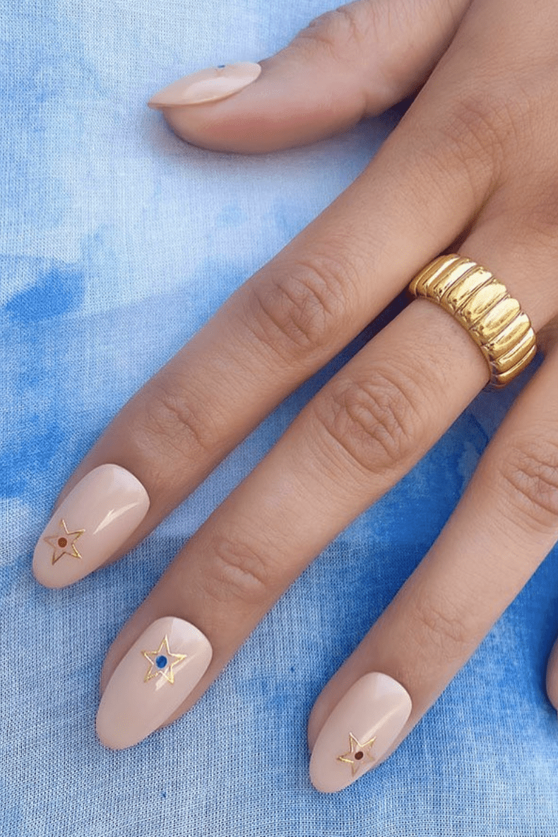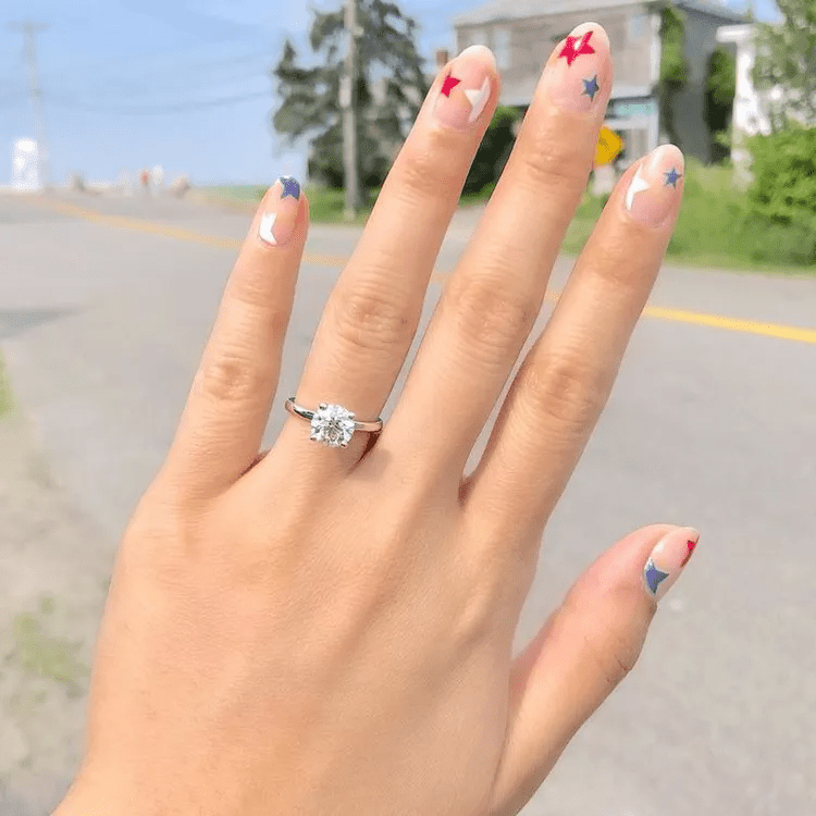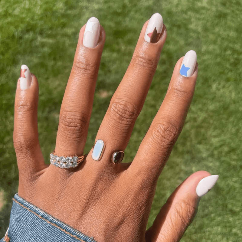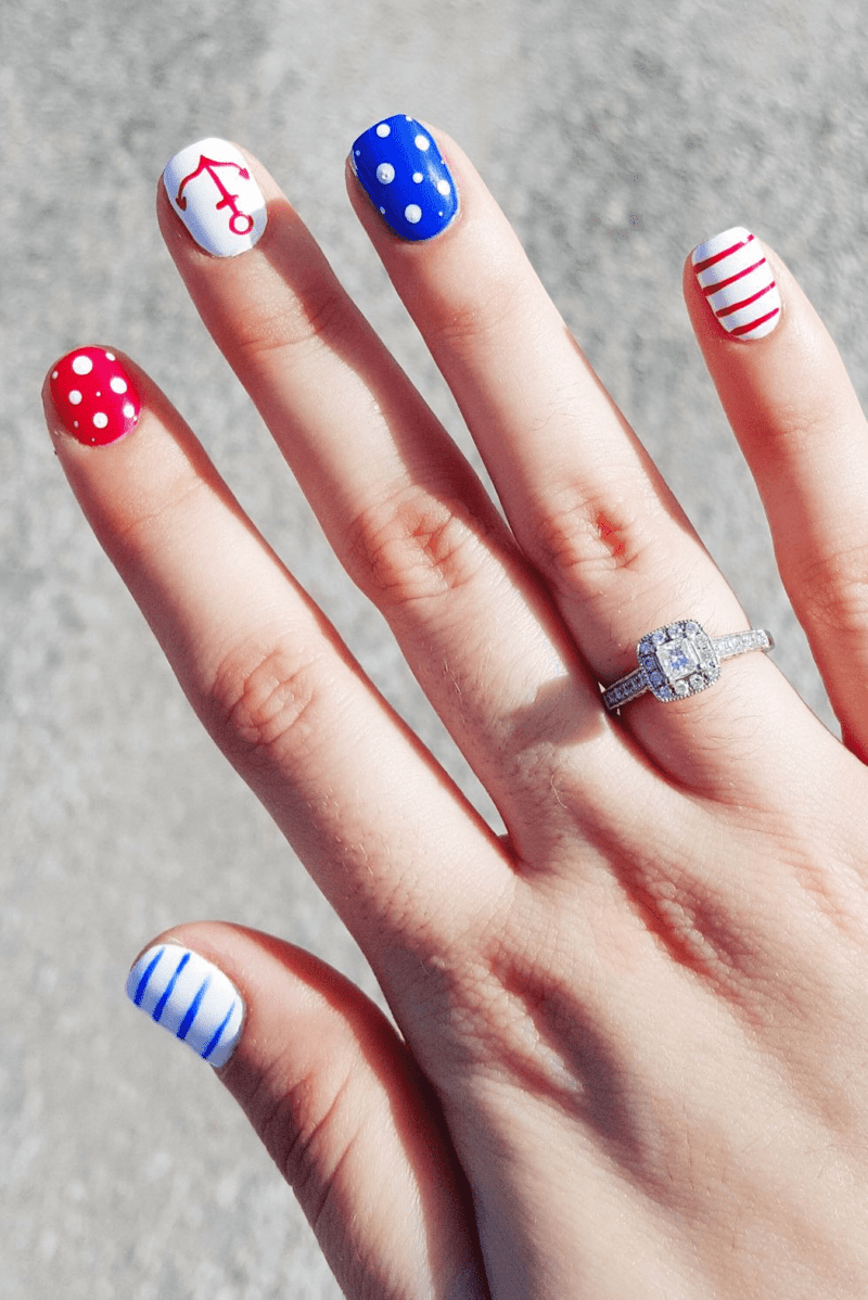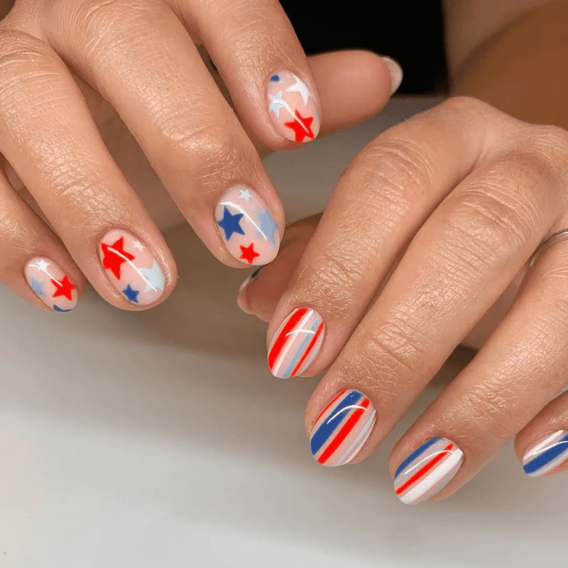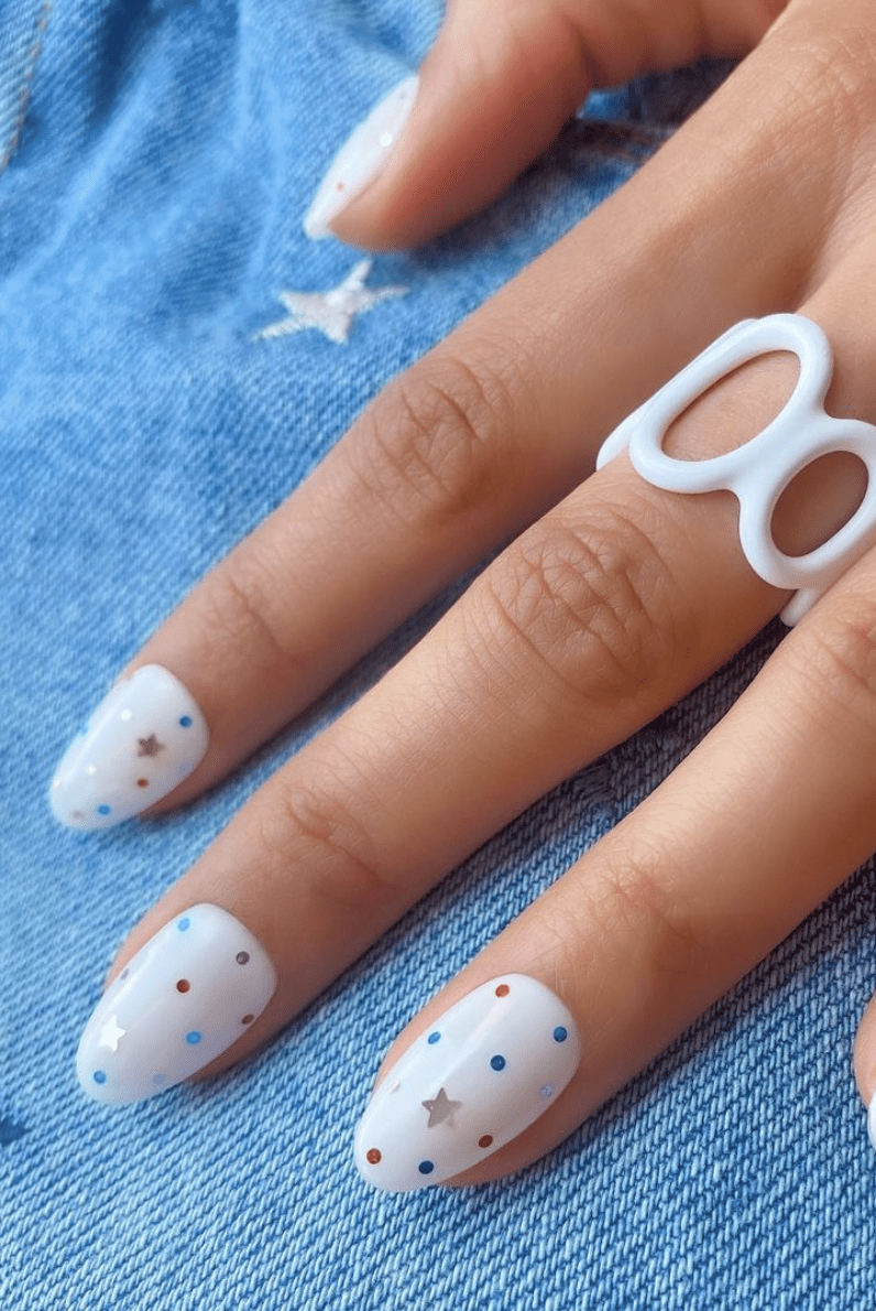 Celebrate Independence Day with a classic red, white, and blue stars mani! Paint each nail a different color from red, white, and blue. Then, using a contrasting color (perhaps silver or gold), use a dotting tool to create small stars in various sizes on each nail. For an extra touch of festivity, you can add a single rhinestone or glitter accent in the center of some of the stars.