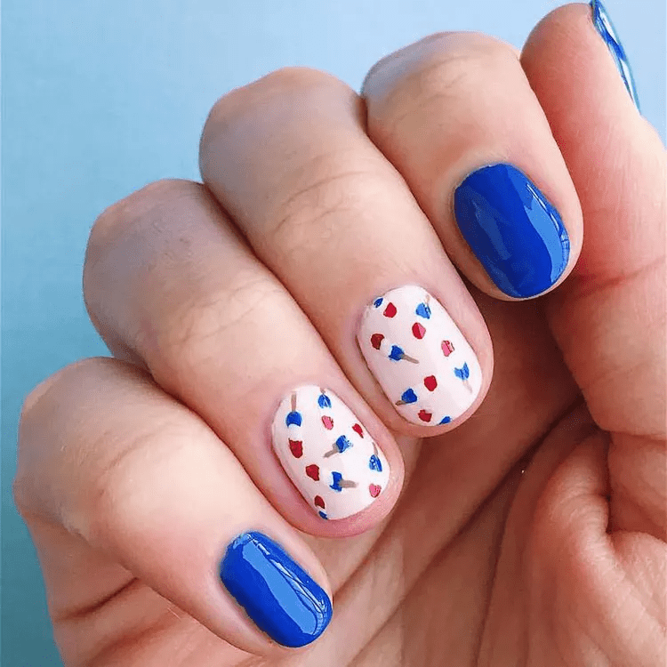 Channel the refreshing vibes of summer with petite popsicle nail art! Paint your nails a base coat in a light pastel color like pink, yellow, or light blue. Then, using a thin nail art brush, paint tiny popsicle shapes in red, white, and blue on each nail. You can even add a small stick at the top for an extra touch of detail. This design is perfect for those who want a cute and festive mani that’s perfect for summer.