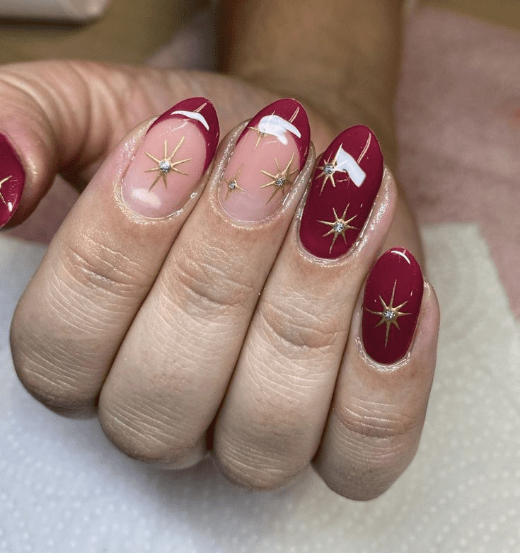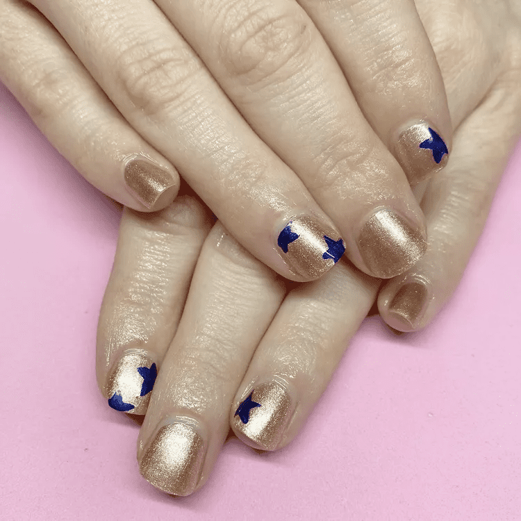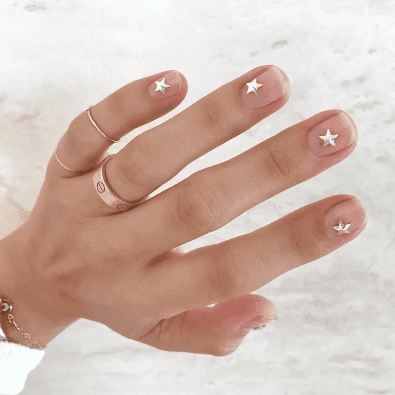 Elevate your mani with chic gold star appliques! Paint your nails in your favorite base color and let them dry completely. Then, using tweezers, carefully apply small gold star nail art appliques to each nail for a touch of instant glamour. This is a simple way to add a festive touch to your manicure, and it’s perfect for those who are short on time or nail art skills.