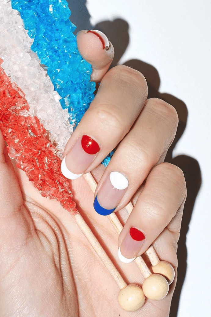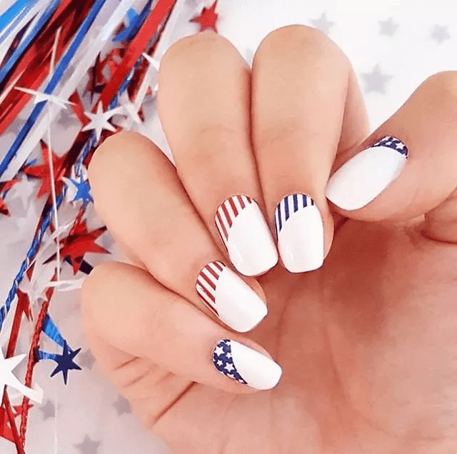 Create a modern and chic look with negative space Fourth of July nail art! Paint one or two accent nails white and leave the rest bare. On the white nails, use stencils or striping tape to create negative space designs in red and blue, like stripes or stars. This design is perfect for those who want a festive mani with a minimalist twist.