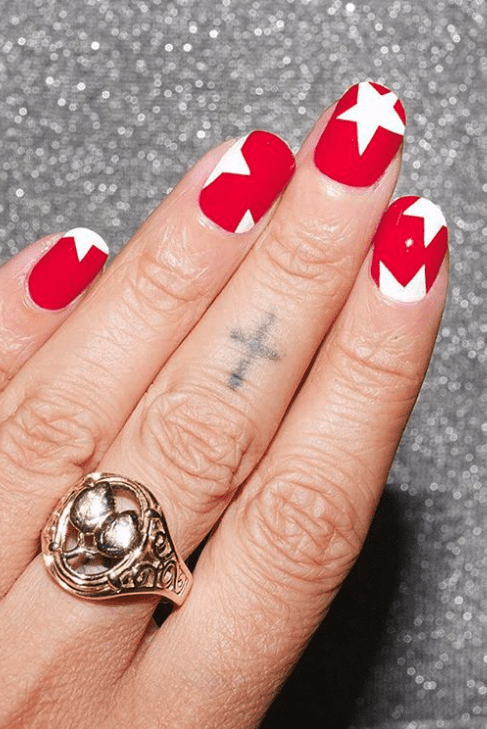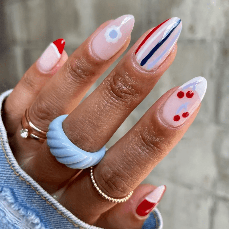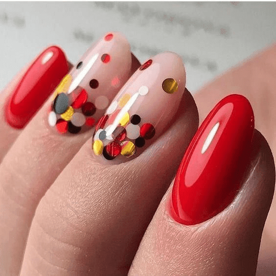 Celebrate in style with a festive red confetti mani! Paint your nails a bold, classic red. Then, using a toothpick or dotting tool, add tiny red, white, and blue confetti dots in various sizes across the base coat. For an extra playful touch, consider using a mix of matte and glossy red polishes for the confetti.