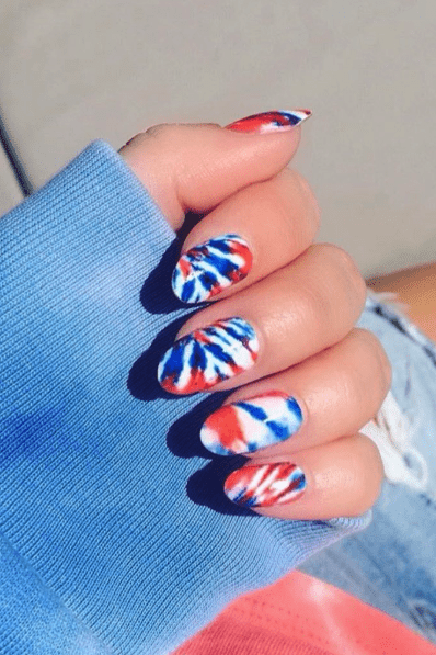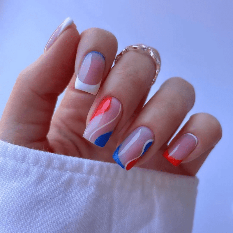 Create a mesmerizing swirl design for your Fourth of July nails! Paint your nails a base coat in white. Then, using a dotting tool and various shades of red and blue polish, create swirling patterns on each nail. For extra pizazz, add a thin white or silver line to accentuate the swirls. This design is perfect for showing off your artistic side and celebrating American spirit in a dynamic way.