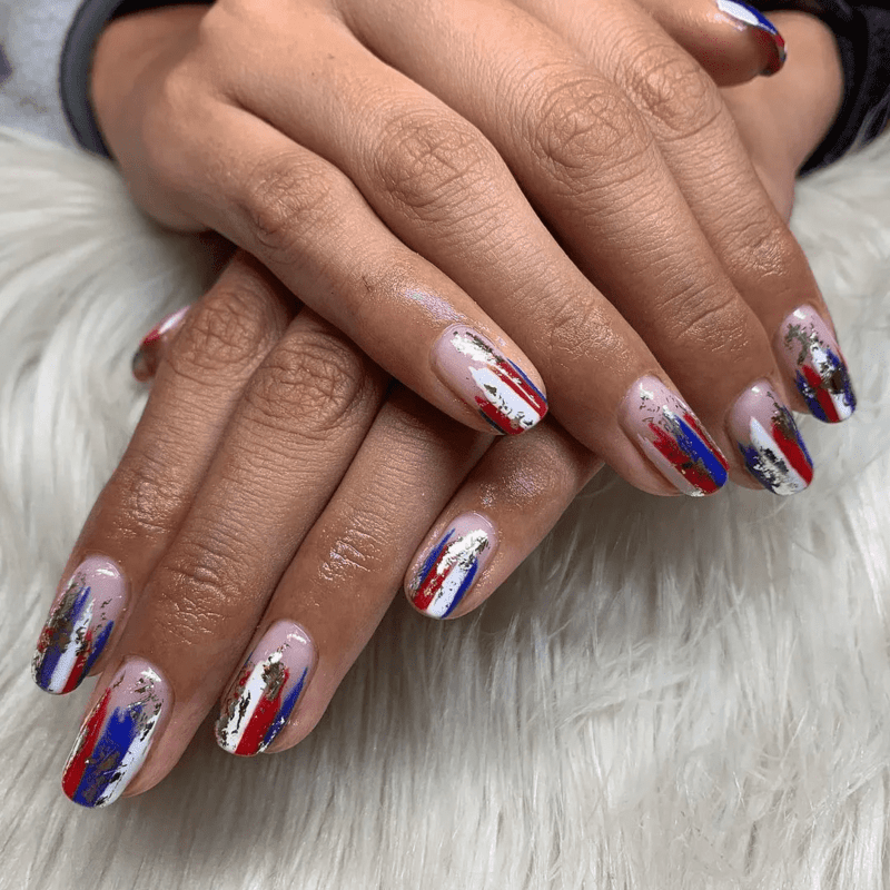 For a glamorous Fourth of July mani, consider foiled stripes! Apply a base coat in your favorite color, then use thin strips of red, white, and blue foil to create stripes or other geometric designs on your nails. For a precise application, use tweezers to handle the foil. Seal the design with a clear top coat for a smooth, finished look. This adds a touch of luxury and shine to your festive manicure.