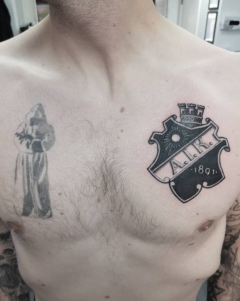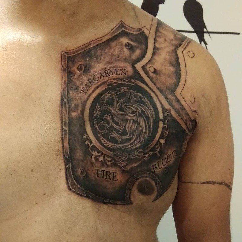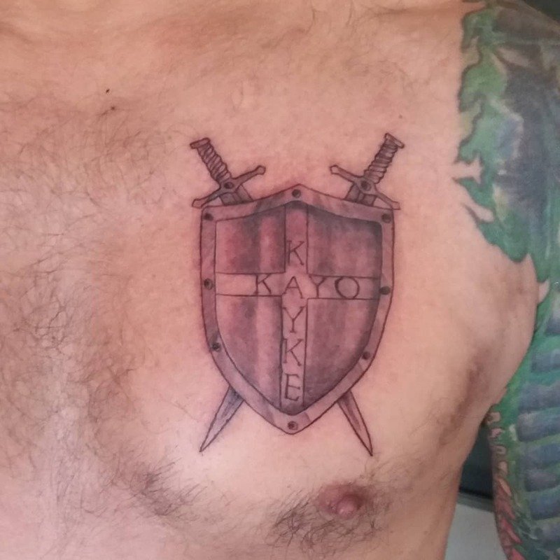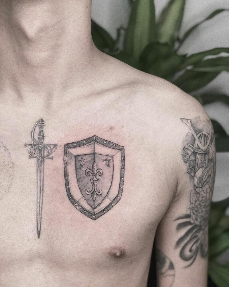 This knight-inspired tattoo is a striking choice for the chest. Consider adding swords or your family crest to create a truly personalized design.